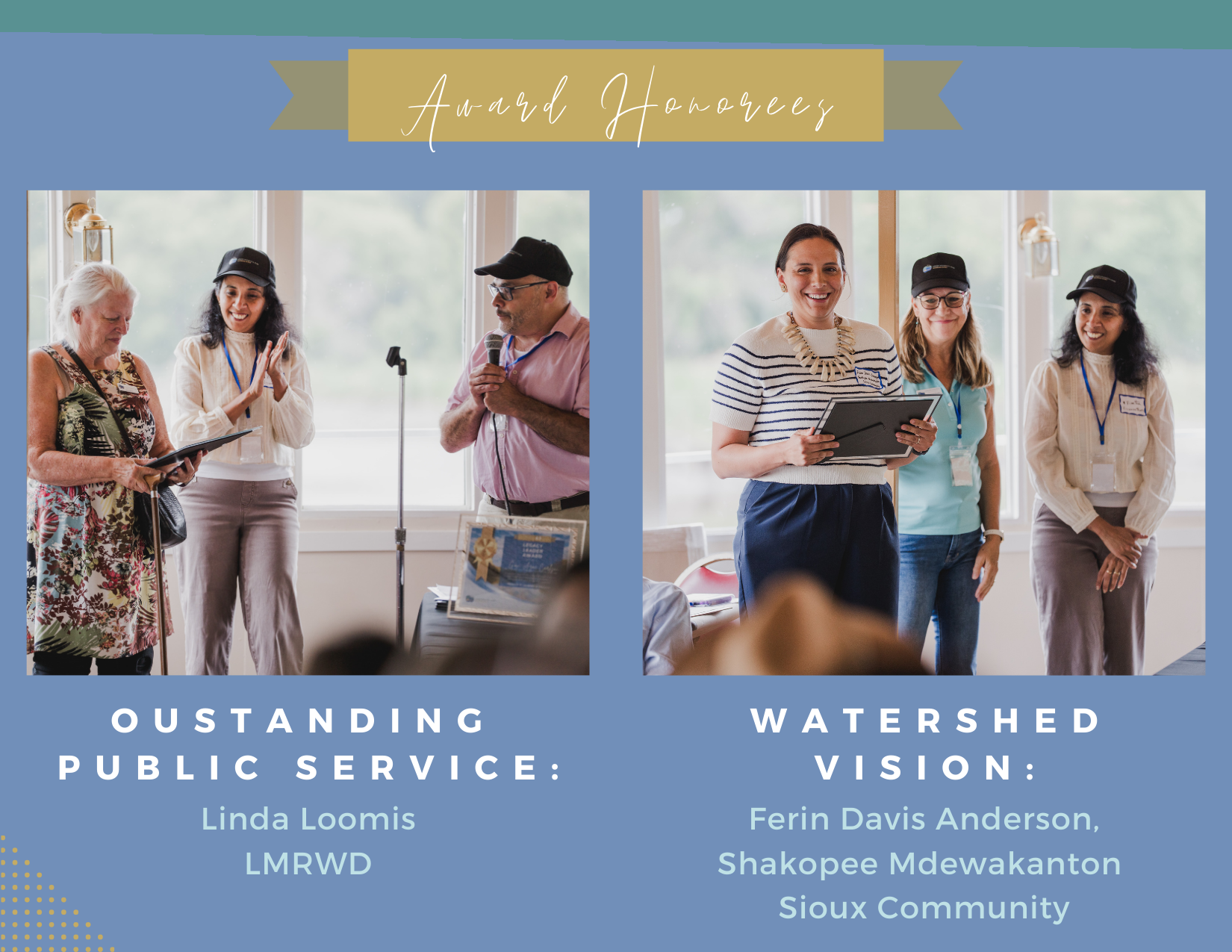 • Watershed Vision Award: Ferin Davis Anderson, Natural Resources Manager, Shakopee Mdewakanton Sioux Community. This award honors exceptional foresight, innovation, and leadership in stewarding water and natural resources, advancing resilient and sustainable solutions for the watershed’s future. Ferin combines cultural knowledge and science to lead watershed and wetland restoration, introducing innovative tools like LiDAR and drone mapping.
