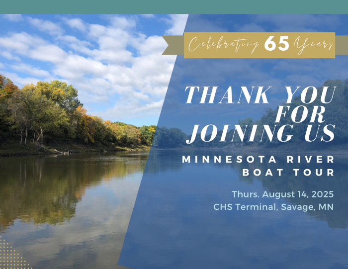 Thank you to everyone who was able to join us on our Minnesota River tour, hosted on August 14 by the Lower Minnesota River Watershed District (LMRWD)! We are so grateful you could participate and value your continued partnership to protect important shared resources. If you weren't able to make it, have no fear. You can get caught up with our event summary and learn about how to stay connected throughout the entire planning process.
