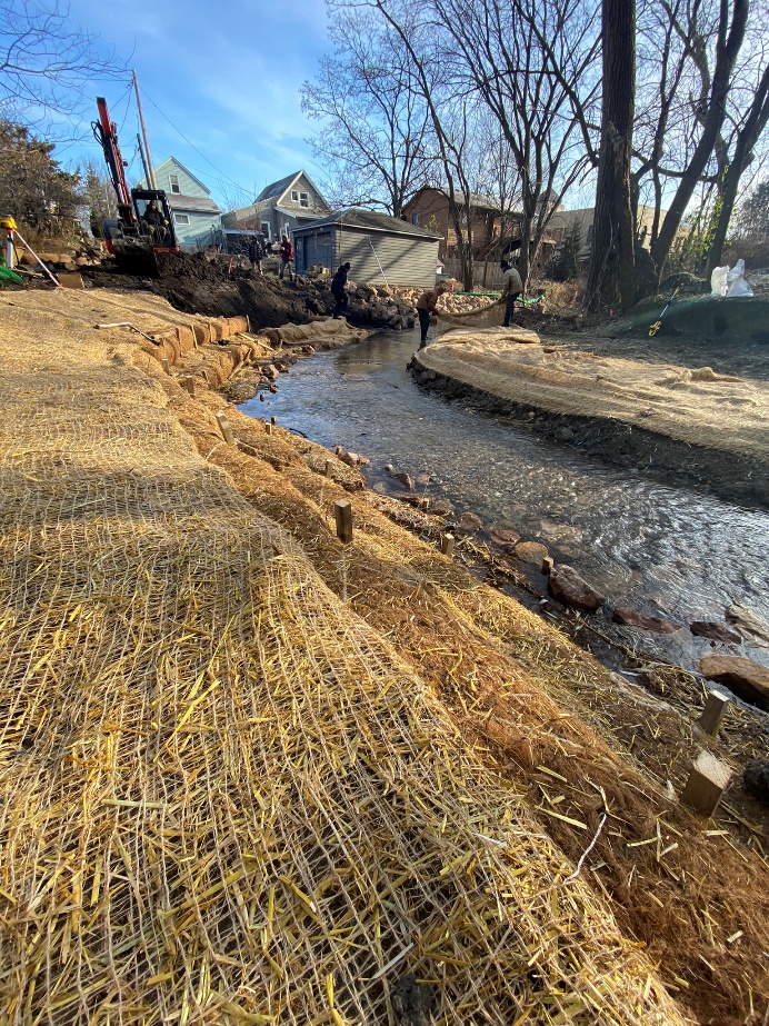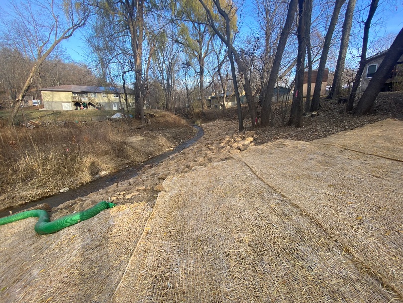 stream channel, installing rip rap, live stakes, and coir log benches, and bank grading and revegetation.Construction took place in 2024 and was completed in November. There are numerous benefits to the Spring Creek ecosystem and surrounding private property, including slower creek velocity to reduce erosion and downstream sedimentation; protection for private property such as garages; and larger stream bend for natural creek flow.
