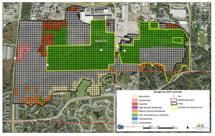 Savage Fen is surrounded by residential, industrial, and commercial land use, with some agricultural areas remaining. The fen cluster is separated from the Minnesota River Valley by State Highway 13 and some light industry to the north. It lies at the base of bluffs that are about 100 feet high to the south. The plateau above the bluffs, which constitutes much of the shallow-groundwater recharge area, is primarily agricultural, residential, and undeveloped.