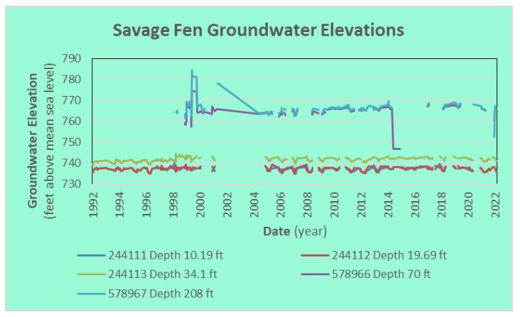 Subtle trends in groundwater elevations appear in the data. The elevation of groundwater in the 34.1-foot deep well appears to have increased by about one to two feet since monitoring began in the early 1990s. Groundwater elevations appear to have increased two to three feet in the deepest wells since about the mid-2000s. These trends suggest an improved supply of groundwater that is needed to sustain the Savage Fen cluster and its unique vegetation.