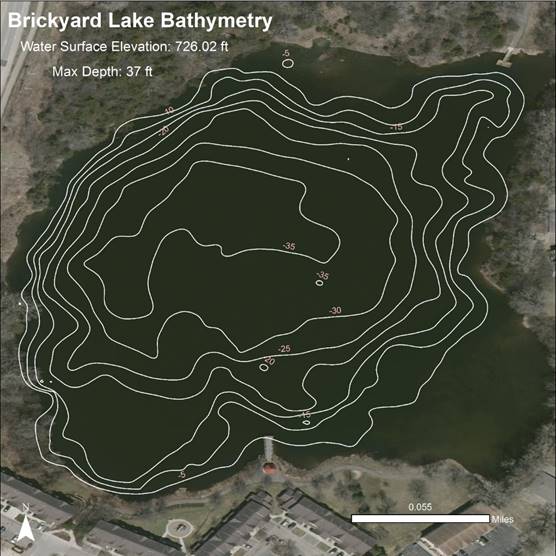 The adjacent graphic shows the depth (bathymetry) of Brickyard Clayhole Lake measured by the Carver County Watershed Management Organization. The maximum depth shown is 37 feet, but greater depths have been measured.