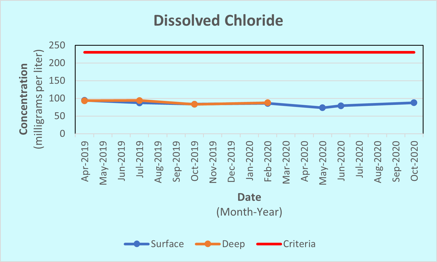 The concentrations of dissolved chloride are below 100 mg/L in Brickyard Clayhole Lake. This level of chloride is well below the state of Minnesota 230 mg/L standard (Statutes, 2021), as shown by the red line on the graph. Samples collected near the surface of the lake, shown in blue, were accompanied by samples collected near the bottom, shown in orange and labeled ‘Deep,’ in 2019 and early 2020. The chloride concentration was nearly the same in surface and deep samples. This indicates that the shallow and deep waters mix. There are numerous sources of chloride, as stated in the Minnesota Statewide Chloride Management Plan, such as from salt applied to roads, parking lots, sidewalks; water softener discharge; agricultural fertilizer; and industrial discharge to name a few (MPCA, 2021).