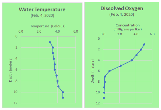 In the winter, under ice cover, the temperature is coldest near the surface ice and warms toward the bottom as the dense, 4.0 degrees Celsius water sinks to the bottom. DO is highest near the surface and is used up by respiration deeper in the water column. If DO gets too low while the lake water is isolated under ice cover, fish and other organisms could be stressed or killed.