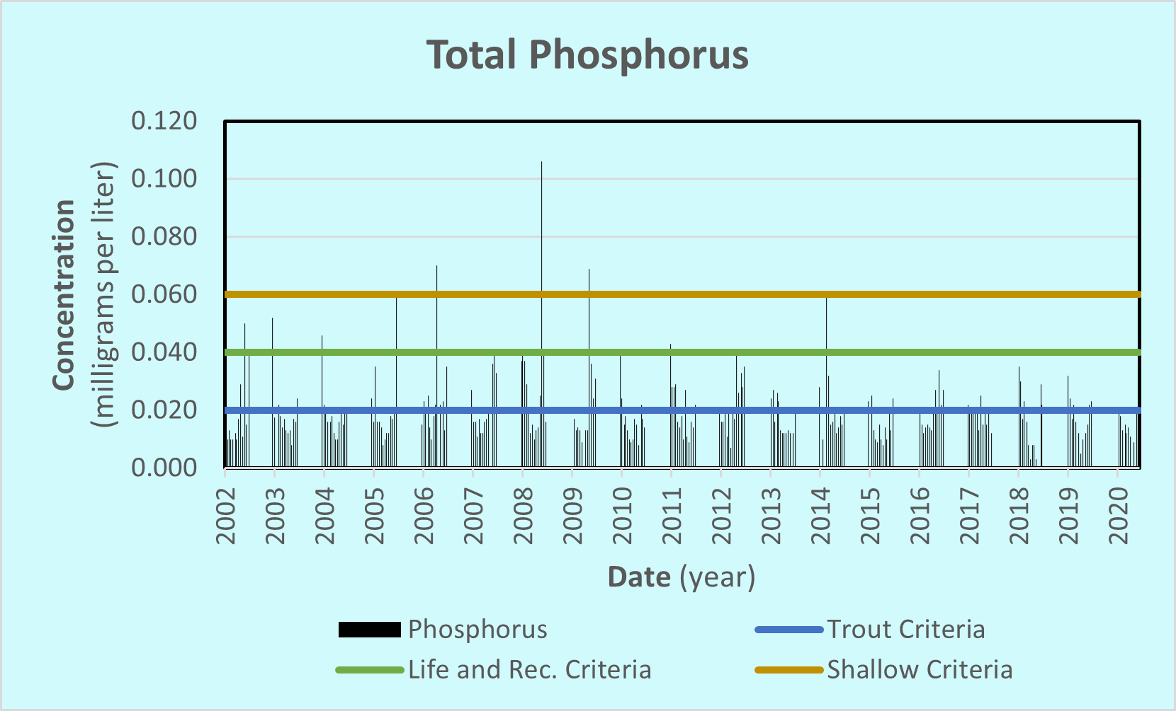 Total phosphorus concentrations in Brickyard Clayhole Lake average around 0.018 mg/L, which is below the limit for Class 2 waters in Minnesota. This is shown by the green line on the graph. Since 2015, concentrations have routinely been within the criteria needed to maintain aquatic life and recreation, and were often within the Class 2A trout waters criteria, shown by the blue line. Phosphorous is necessary for plant life, but too much can cause an increase in aquatic plant growth that uses up oxygen needed by fish and other aquatic life.