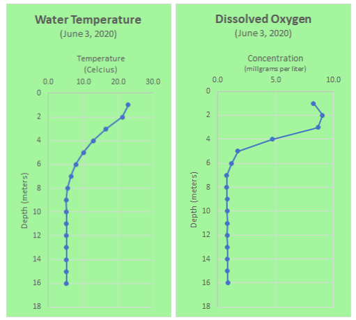 In the summer, warm water is near the surface, whereas dense, cold water stays near the bottom. This thermal stratification (i.e., layering) keeps well-oxygenated water at the surface and lower oxygen water near the bottom. In June, at about 2 meters, the DO level was higher because increased amounts of algae and other plant life produced excess oxygen. At greater depths, the oxygen can be used up as organic matter decomposes.