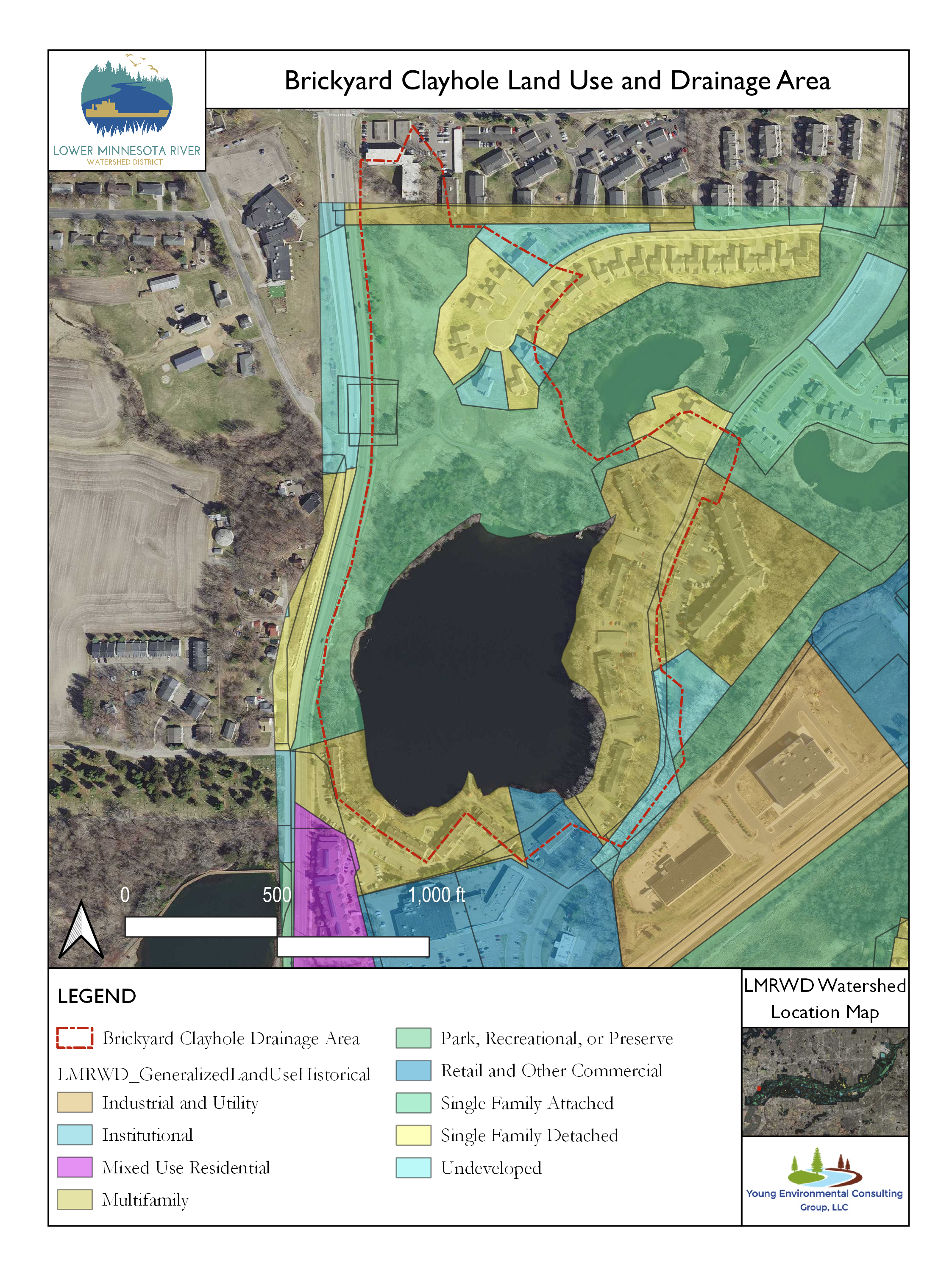 The area of land that drains overland water flow (e.g., rainfall, snowmelt) to Brickyard Clayhole Lake is shown in the adjacent graphic. Much of the area draining to the lake consists of single and multifamily homes with parkland to the north and west.