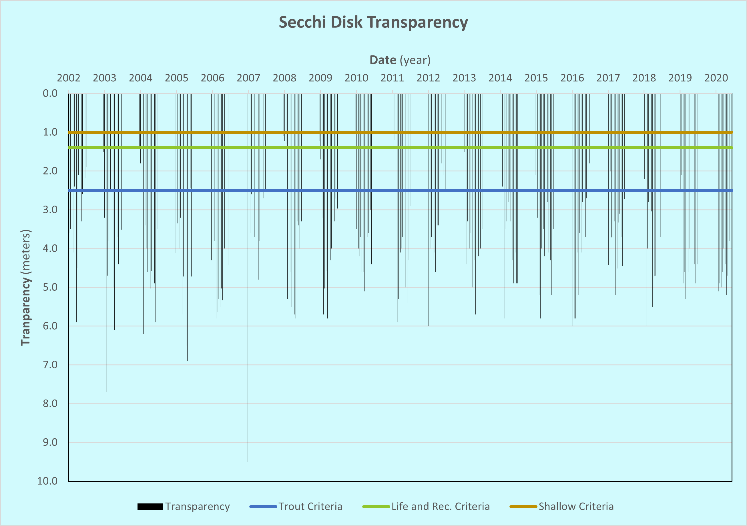 The transparency, a measure of water clarity, of Brickyard Clayhole Lake is good—often over 4 meters (13 feet). Many of the readings exceed the 2.5-meter criteria for class 2A trout lakes in Minnesota (Statutes, 2021).