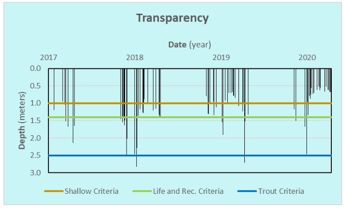 The transparency of Gun Club Lake usually meets the criteria for shallow lakes and occasionally exceeds the 2.5-meter (8.2-foot) criterion for Class 2A trout lakes in Minnesota (Statutes, 2021). It is unclear how a lake officially reported to be 2.5 feet deep could have a transparency of 8.2 feet, but the depth of floodplain lakes can vary in response to changing depths of nearby waterways.