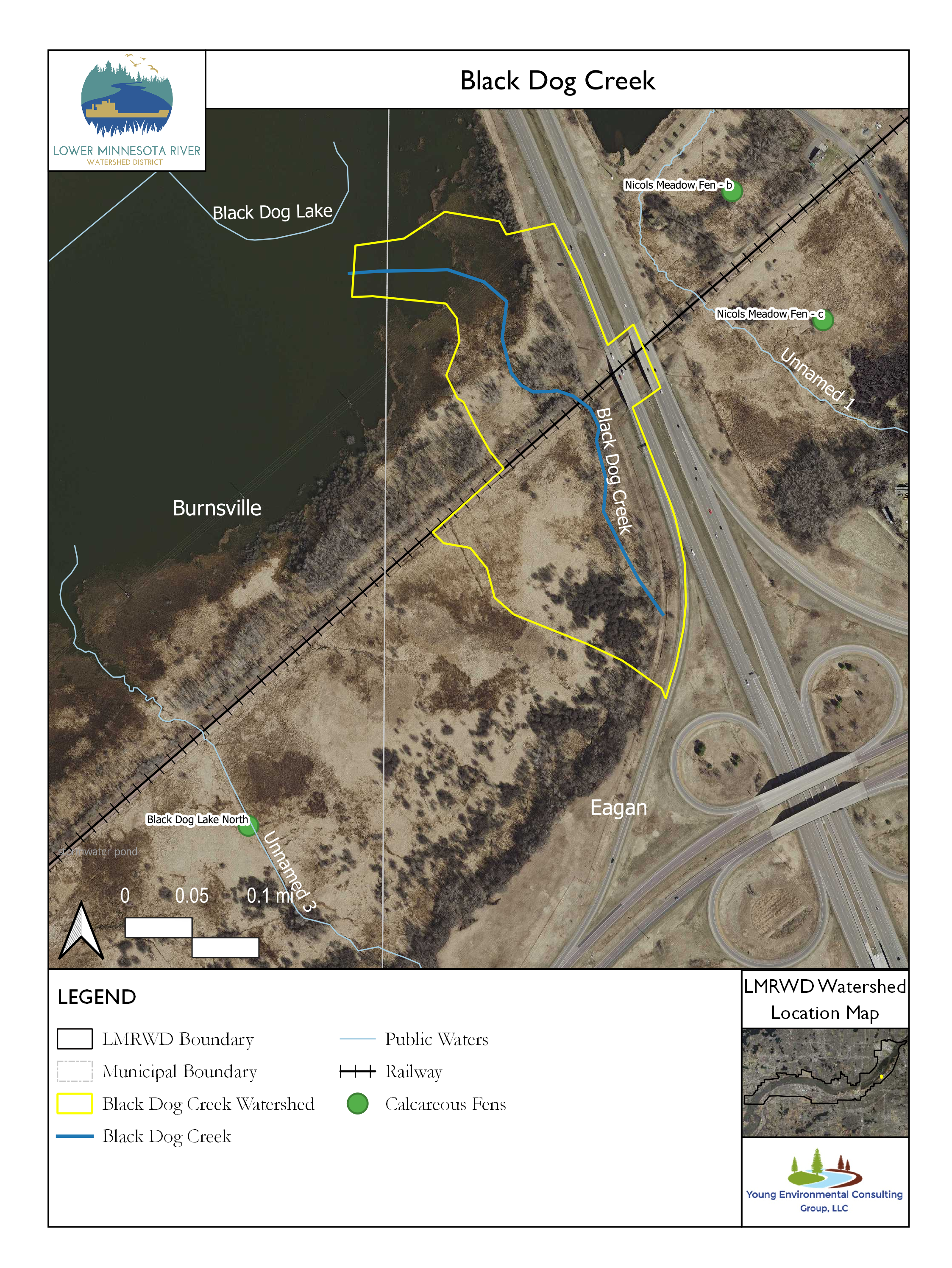 Black Dog Creek is a small stream within the City of Burnsville in Dakota County, Minnesota, that discharges into Black Dog Lake. Much of the creek is within the Lower Minnesota River floodplain. In 1896 the creek had a drainage area of over 4,500 acres but watershed alterations and channel realignments over the years have divided the watershed into many small streams, including Black Dog Creek, which presently has a drainage area of only 29 acres (Young 2022). The creek relies mostly on groundwater discharge for its flow.