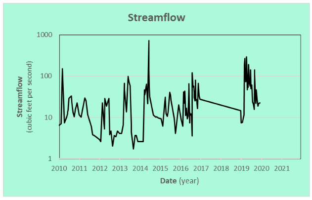 Credit River is sampled by the Metropolitan Council Environmental Services (MCES) as part of the Comprehensive Water Quality Assessment of Select Metropolitan Area Streams (MCES 2014). Selected results from the analysis of samples collected at a site in Savage, Minnesota, 0.9 miles (1.4 kilometers) above its mouth were obtained from the websitei and are summarized in the following graphs.
