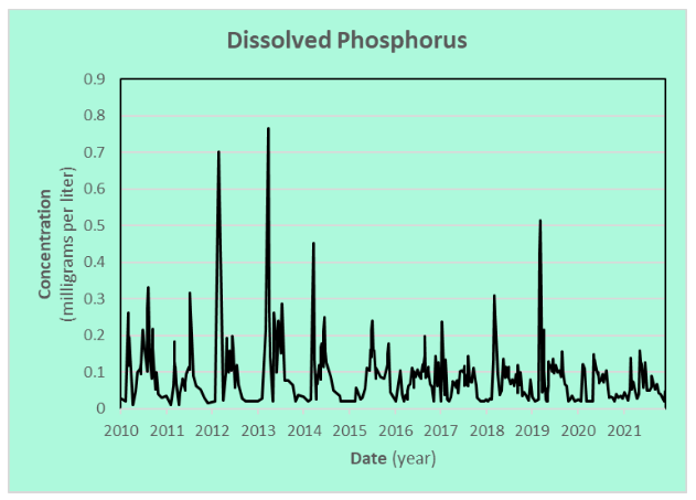Phosphorus is an essential plant nutrient that is carried by streams. Naturally occurring phosphorus concentrations may be enriched from animal waste and fertilizers, and phosphorus is often introduced with runoff. Phosphorus is often associated with sediment but is more available to plants when dissolved in the water. The adjacent chart shows the phosphorus concentrations in samples from Credit River after the water has been filtered to remove the sediment-associated phosphorus, which generally is considered dissolved phosphorus.