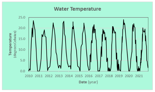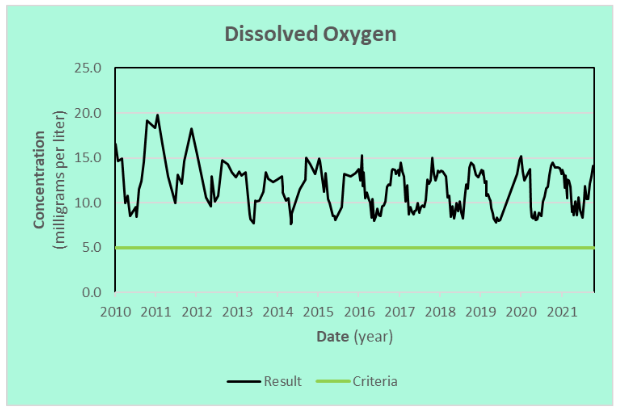 DO concentration measurements show that Credit River remains well oxygenated. Aquatic animals typically need at least 5 mg/L of DO (MNDNR 2021). Seasonal fluctuations are normal because oxygen solubility changes with water temperature.