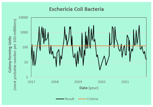 Eschericia coli (E.coli) is an organism used to indicate the amount of fecal contamination in lakes and streams. Swimming in or ingesting water with high levels of E. coli could result in illness. The allowable limit is a monthly average of fewer than 126 colony-forming units per 100 milliliters of water between April and October (MPCA 2021). Credit River water often has levels of E. coli that could exceed the allowance for recreational and human health.