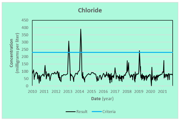 Chloride, a primary component of road deicing and water-softening salt, represents a growing concern for many streams and lakes. The chronic standard for chloride in Minnesota waters to protect cool and warm water fisheries is 230 mg/L (MPCA 2018). Chloride concentrations measured in Credit River are usually far below the chronic standard but occasionally exceed the standard. Peak concentrations were measured in the winter.