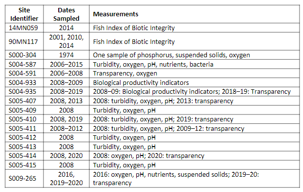 Minnesota Pollution Control Agency (MPCA) sites for Credit River are listed in the adjacent table. The table also identifies when and what measurements were made at the site. Those data can be accessed at https://webapp.pca.state.mn.us/surface-water. Although many sites were sampled, most of the sites are near each other in a park in Savage, approximately two miles (three kilometers) upstream from the confluence with the Minnesota River.