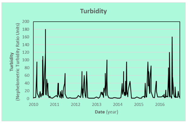 Various methods have been used since 2010 to measure turbidity in Credit River, and the results using different methods are not comparable. Only the measurements reported in nephelometric turbidity ratio units (NTUs) are shown in the chart.