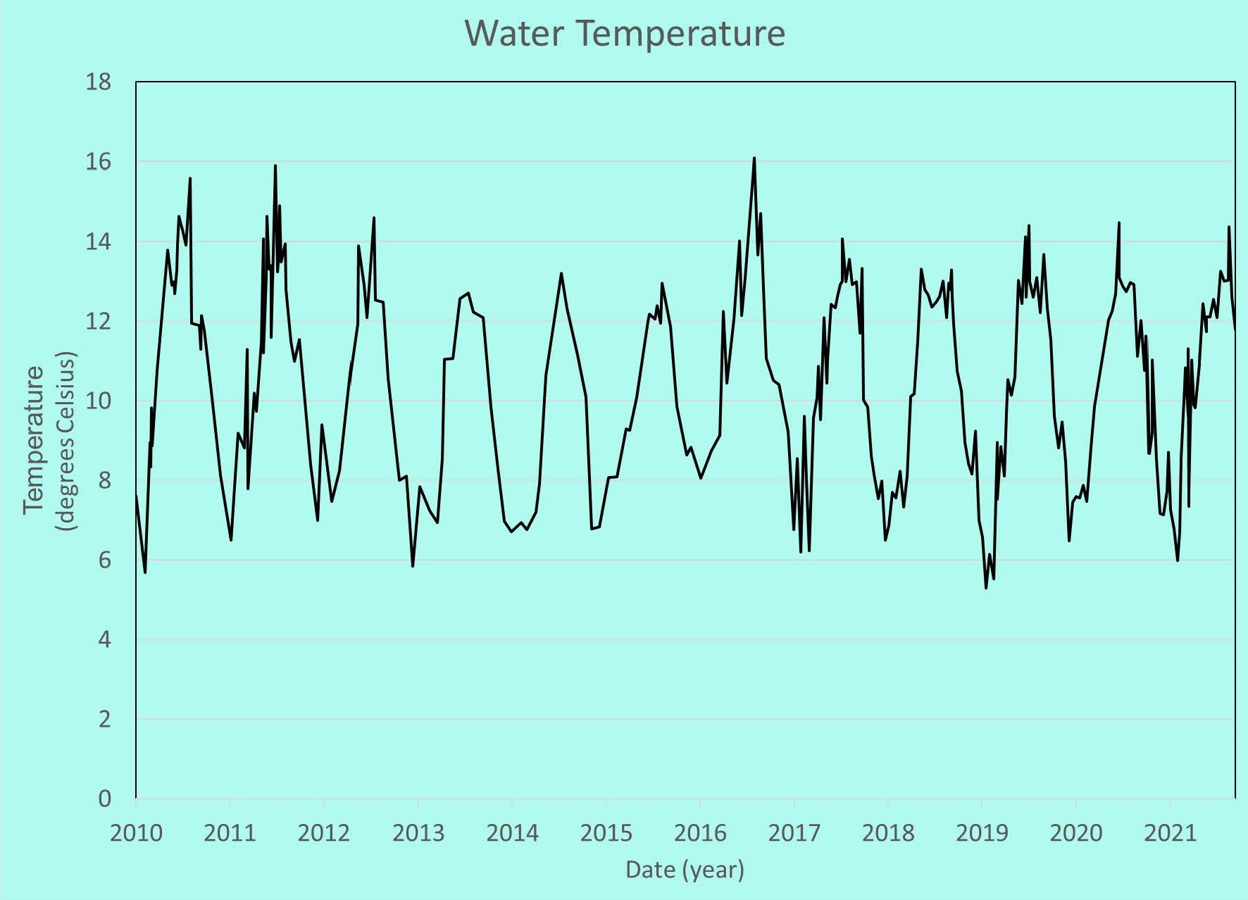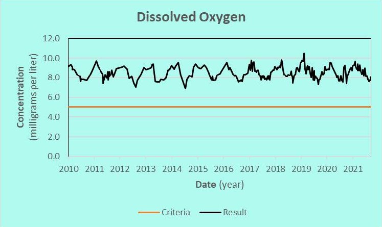 Measurements of dissolved oxygen (DO) concentration show that Eagle Creek remains well oxygenated. Trout typically need at least 5 mg/L of DO (MNDNR 2021). The narrow range of fluctuation in DO concentration helps maintain a healthy, low-stress habitat.