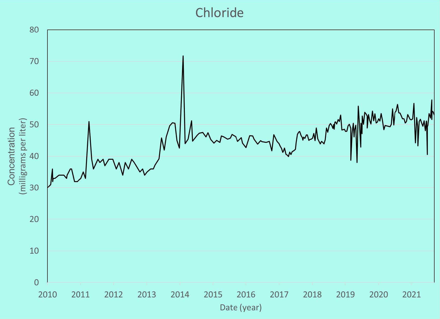 Chloride, a primary component of road deicing and water-softening salt, is a growing concern for many streams and lakes. The chronic standard for chloride in Minnesota waters to protect both cool and warm water aquatic life is 230 mg/L (MPCA 2018). The chronic standard is defined in Minnesota Rules 7050.0218, subpart 3.l. as “the highest water concentration of a toxicant to which organisms can be exposed indefinitely without causing chronic toxicity.” Chloride concentrations in Eagle Creek are well below the chronic standard but have trended upward over the past 10 years.