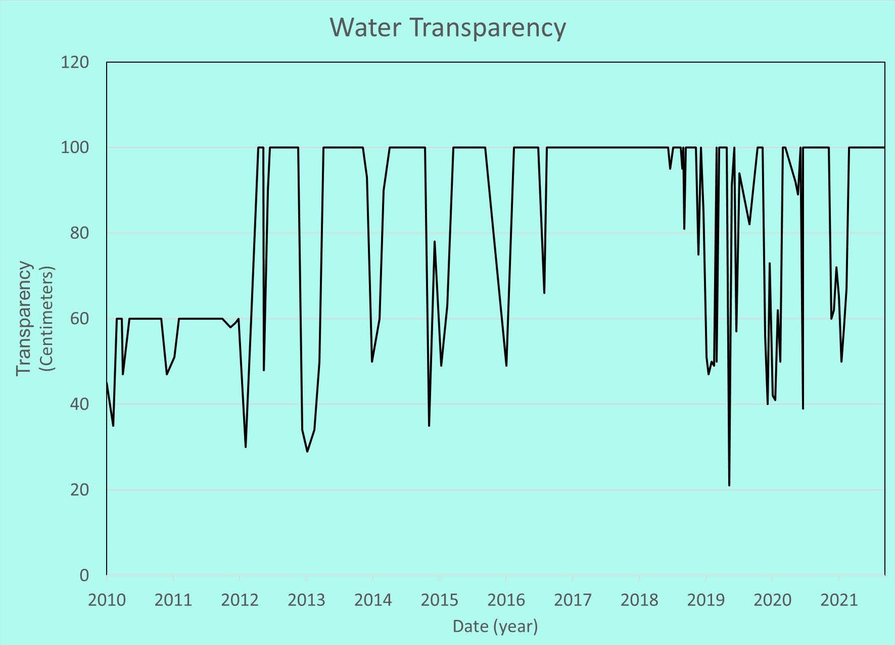 The transparency, a measure of water clarity, of Eagle Creek is shown in the following graph. High transparency in a stream indicates clear water that is not carrying a lot of the fine material that is detrimental to the trout habitat and can smother spawning beds. Low transparency suggests that a lot of sediment is carried by the stream, which may be associated with other contaminants and could harm the trout habitat. The transparency of Eagle Creek water often exceeded the length of the transparency tube (the device used to measure the transparency). Most of the readings between 2010 and 2012 were greater than the 60-cm length of the tube. The 100-cm tube, which started to be used in 2012, was also inadequate for many measurements because the mostly spring-fed creek was so clear. Drops in transparency suggest that changes in flow from runoff or other influences have resulted in the stream carrying more sediments. Most aquatic life can tolerate and quickly recover from brief periods of increased sediment.