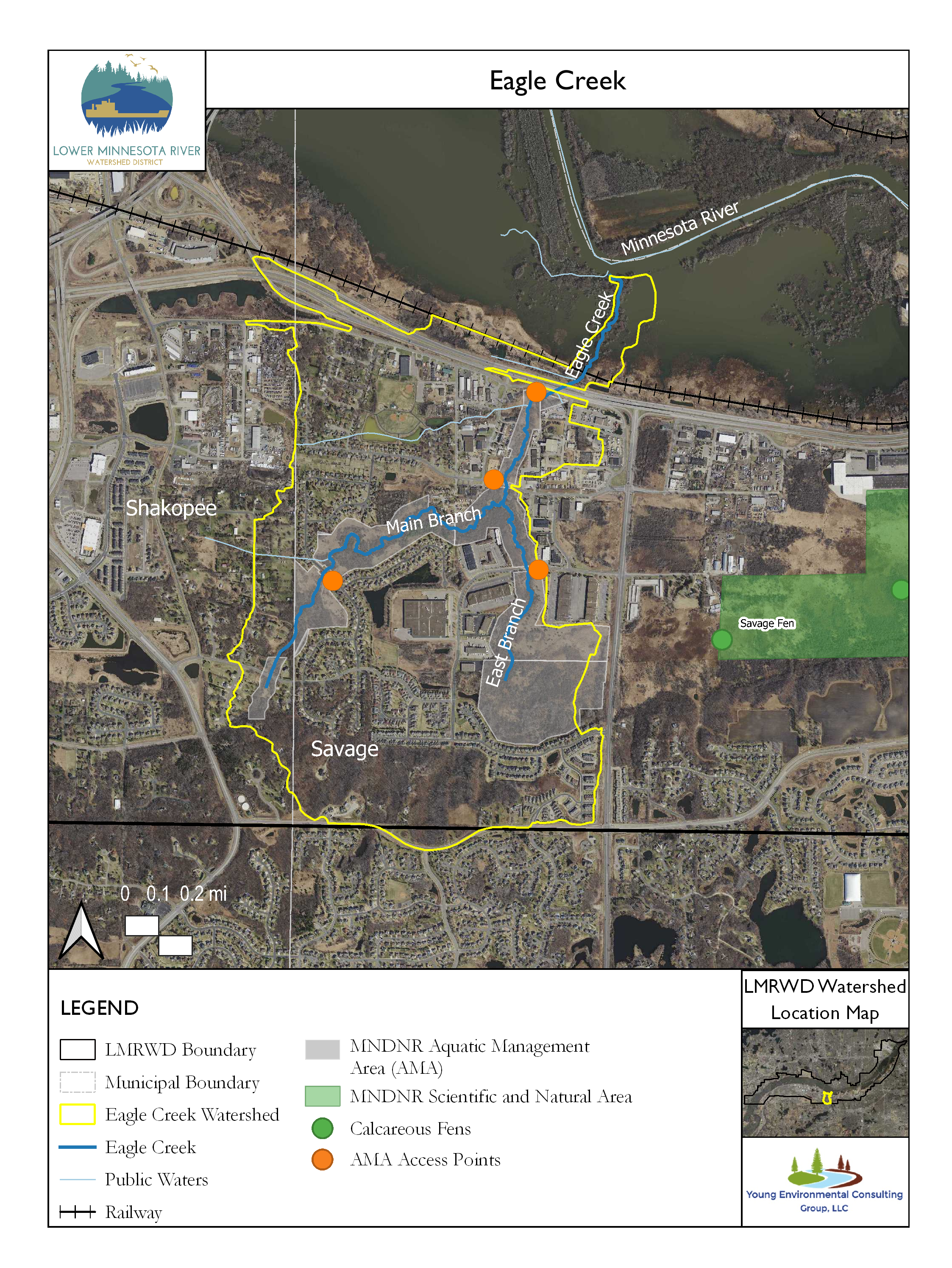 In the early 1990s, the area around Eagle Creek was designated as Minnesota’s first aquatic management area (AMA). The AMA creates a buffer around Eagle Creek to protect the stream from future development and provides angler and management access (MNDNR 2021). One of these accesses is a small parking lot located south of State Highway 101 along the frontage road. Three other access points are via roadside pull-offs along Independence Avenue, West 126th Street, and Eagle Creek Parkway (MNDNR n.d.).