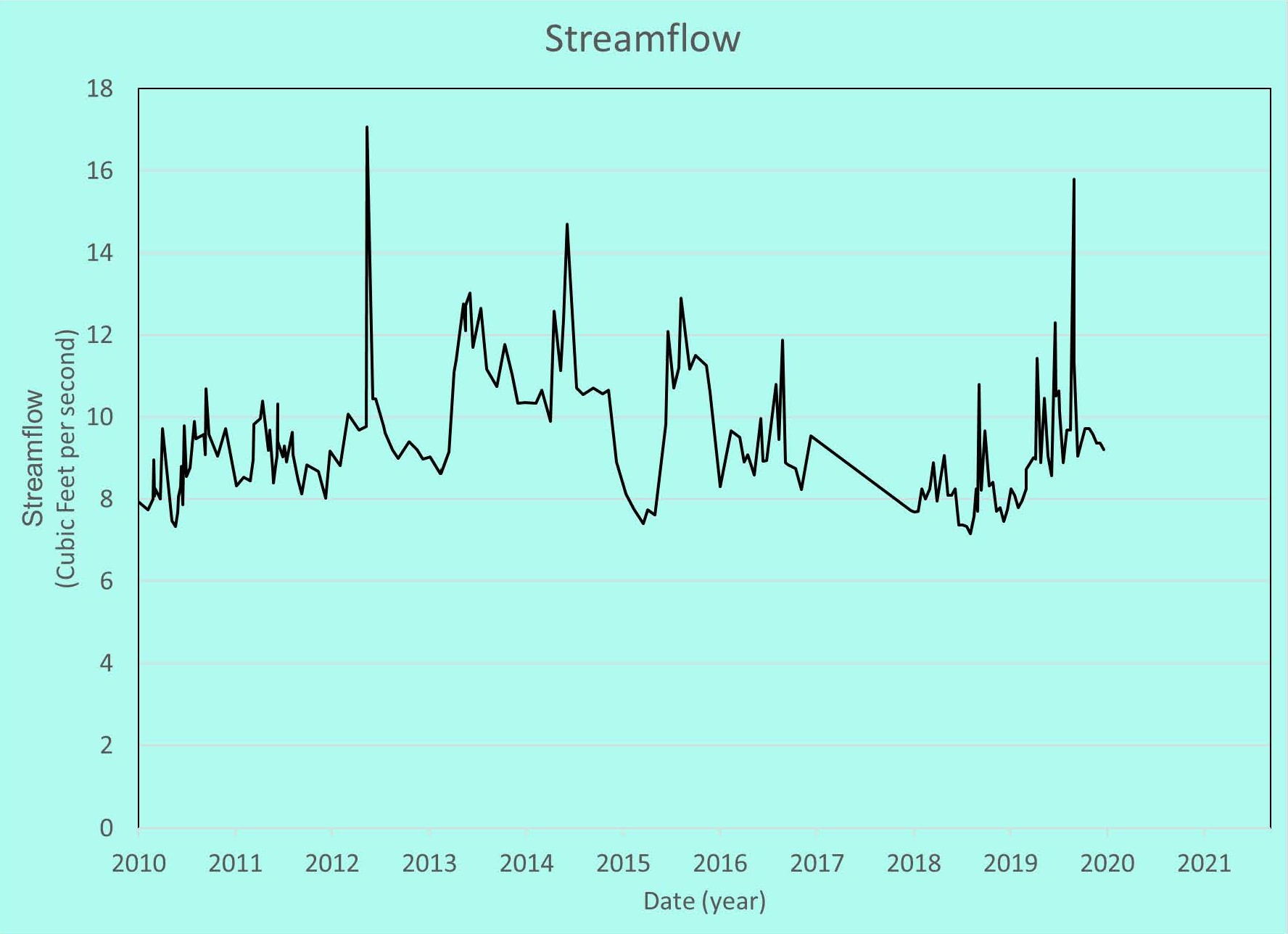 The streamflow of Eagle Creek, when samples were collected, is shown below. The range in streamflow is not significant because the creek is mainly fed by a steady discharge of groundwater with little surface drainage contributing to runoff that would add to the variability, or “flashiness,” of the creek. There are no aquatic life criteria for streamflow, but sustained streamflow ensures other habitat characteristics such as flow velocity and water depth are optimal for trout.
