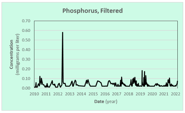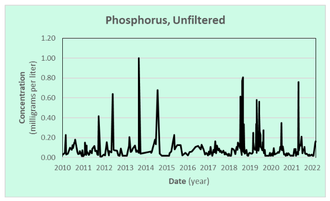 Phosphorus is an essential plant nutrient that is carried by streams. Naturally occurring phosphorus concentrations may be enriched from animal wastes and fertilizers and phosphorous is often introduced with runoff. Phosphorus is often associated with sediment but is more available to plants when it is dissolved in the water. The adjacent charts show the concentrations of phosphorus in samples from Nine Mile Creek. The first chart shows the total amount of phosphorus in the water, including the part associated with particulate matter containing suspended sediment. The second chart shows the phosphorus remaining in the water after the sample has been filtered to remove the sediment-associated phosphorus.