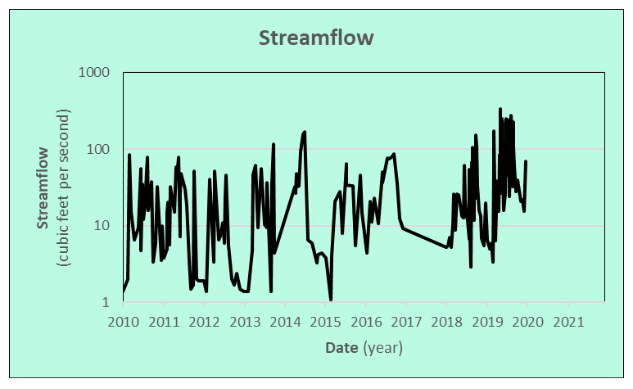Samples collected from Nine Mile Creek’s streamflow—the amount of water carried by the creek at the sampling site—are shown in the adjacent chart. The streamflow data are processed separately from the other data, and the streamflow measurements for 2020–21 had not been updated in the database when the data were downloaded on March 28, 2022.