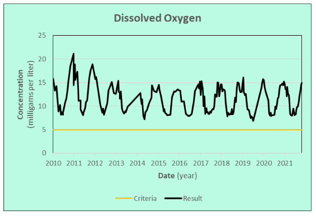 DO concentration measurements show that Nine Mile Creek remains well oxygenated. Aquatic animals typically need at least 5 milligrams per liter (mg/L) of DO (MNDNR, 2021). Seasonal fluctuations are normal because oxygen solubility changes with water temperature. The value of 21 mg/L on February 13, 2011, is higher than usual for natural waters, because at the sample temperature of 0.8°C (33°F), the creek is expected to hold no more than 14.3 mg/L.