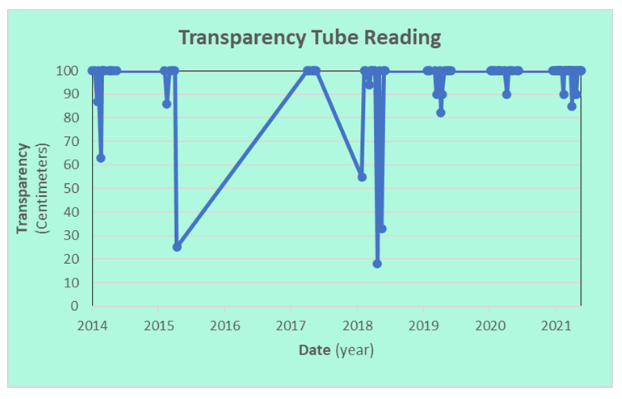 The adjacent graph shows the transparency, a measure of water clarity, of Nine Mile Creek. High transparency in a stream indicates clear water that is carrying little suspended material. Low transparency implies that the stream is turbid and carrying a lot of sediment. Streams carrying runoff tend to be turbid and have low transparency while they might otherwise run clear. Most of the readings from Nine Mile Creek are at 100, suggesting that the transparency often exceeds the 100-centimeter limit of the tube used to measure the transparency.