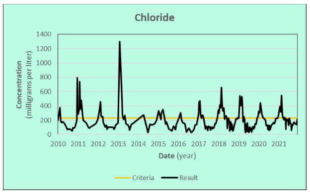 Chloride, a primary component of road deicing and water-softening salt, represents a growing concern for many streams and lakes. The chronic standard for chloride in Minnesota waters to protect cool and warm water fisheries is 230 mg/L (MPCA 2018).