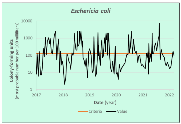 Escherichia coli (E. coli) is a bacterium measured to quantify the amount of fecal contamination in lakes and streams. Swimming in or ingesting water with high levels of E. coli could result in illness. The allowable limit is a monthly average of fewer than 126 colony-forming units per 100 milliliters of water between April and October (MPCA, 2021). Nine Mile Creek often has levels of E. coli that exceed the allowance for recreation and human health.