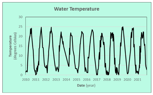The water temperature of Nine Mile Creek is important for habitat because warmer water holds less dissolved oxygen (DO) needed by many aquatic organisms. Temperatures at the sampling site fluctuate seasonally, rarely exceeding 77° Fahrenheit (25° Celsius) in the summer and averaging near 32°F (0°C) in the winter.