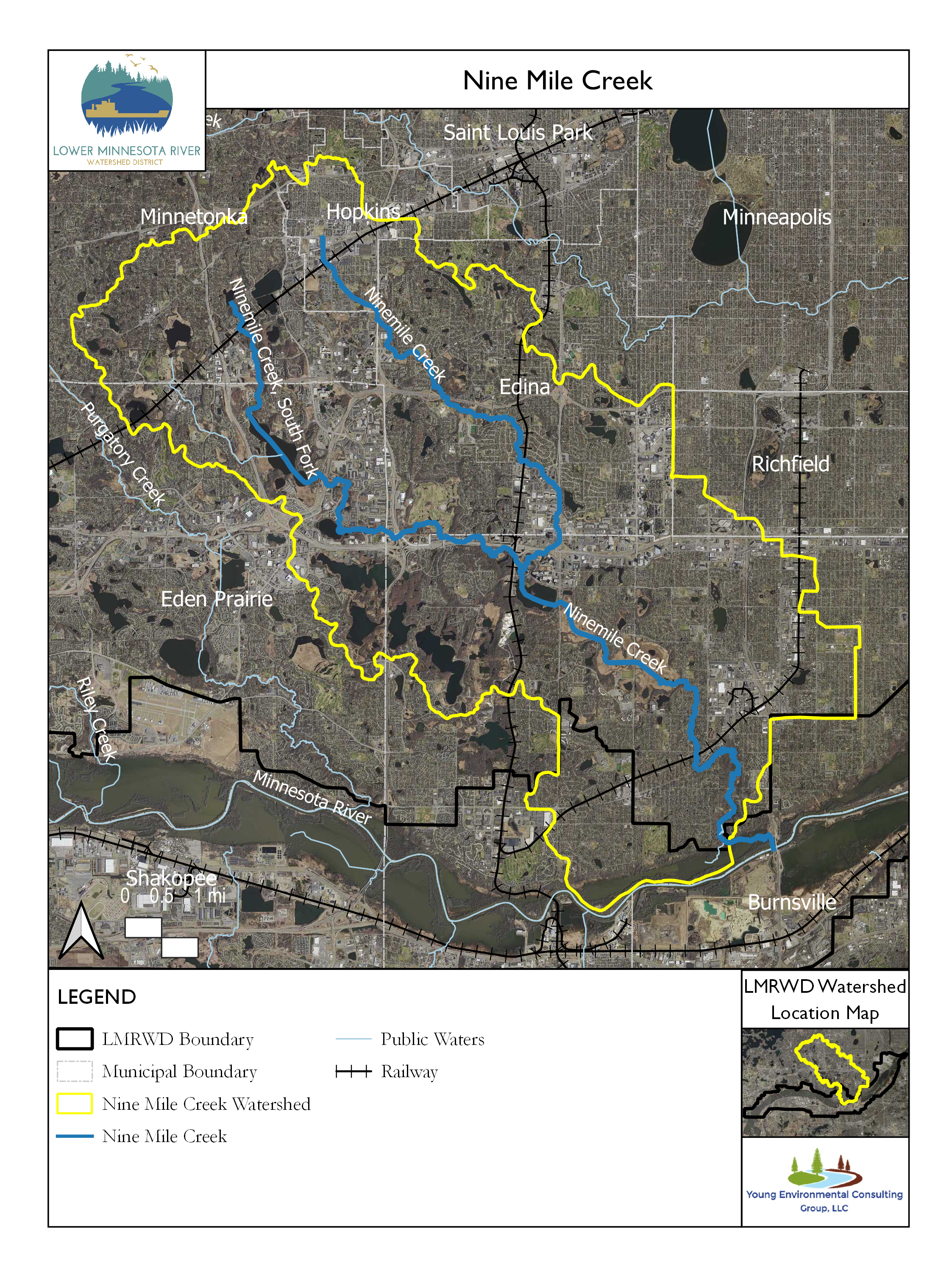 Nine Mile Creek, also known as Ninemile Creek, is a 15-mile (24-kilometer) stream located in Hennepin County that drains about 50 square miles (13,000 hectares; MCES, 2014a). After flowing south through several lakes and communities, Nine Mile Creek empties into the Minnesota River. The watershed is 64 percent developed urban land, and the remainder is woodland, grassland, wetland, and open water (MCES, 2014a). Nine Mile Creek is impaired for aquatic life by elevated chloride concentrations (MPCA, 2022). Its designation of impairment is also based on benthic macroinvertebrate bioassessments and fish bioassessments. Our expectation is that these impairments will be addressed by 2028 (MPCA, 2022). Only a small portion of the Nine Mile Creek watershed (near the mouth of the creek) is in the Lower Minnesota Watershed District (LMRWD).