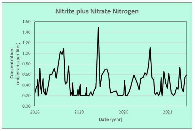 Nitrogen is also an essential plant nutrient carried by streams, and naturally occurring concentrations may be similarly enriched from animal wastes and fertilizers. Nitrite plus nitrate nitrogen is a commonly measured form of nitrogen that is readily available for plants. It is highly water soluble and often found as a contaminant in groundwater beneath agricultural land. At concentrations above 10 mg/L, much higher than measured in Nine Mile Creek, it may be toxic to humans. The method used to analyze the samples cannot accurately quantify levels below 0.20 mg/L, so 0.20 mg/L is the lowest concentration reported.