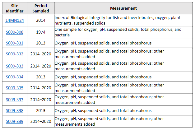 Riley Creek is identified by stream Kittle number M-055-01 (NRRI, 2022) and Minnesota Pollution Control Agency (MPCA) assessment unit 07020012-511. This link connects to sample data described in the adjacent summary table. The sites are located at various points along the stream, above or below lakes, inflows, and other points that might affect the quality of the creek.