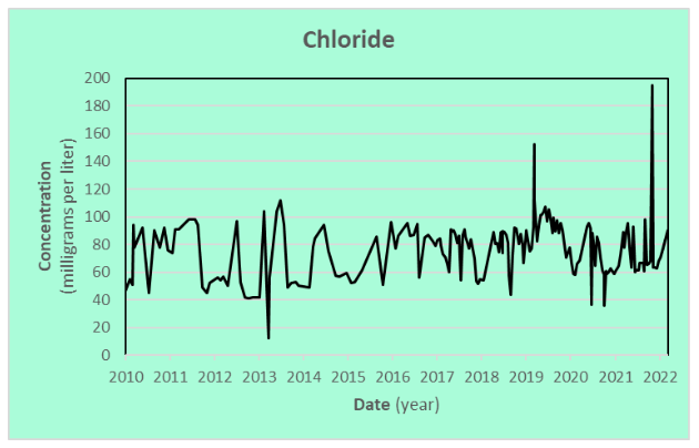 The adjacent chart shows the Riley Creek chloride concentrations since routine sampling started in 2014. Peak concentrations have approached 200 mg/L, well below the chronic standard.