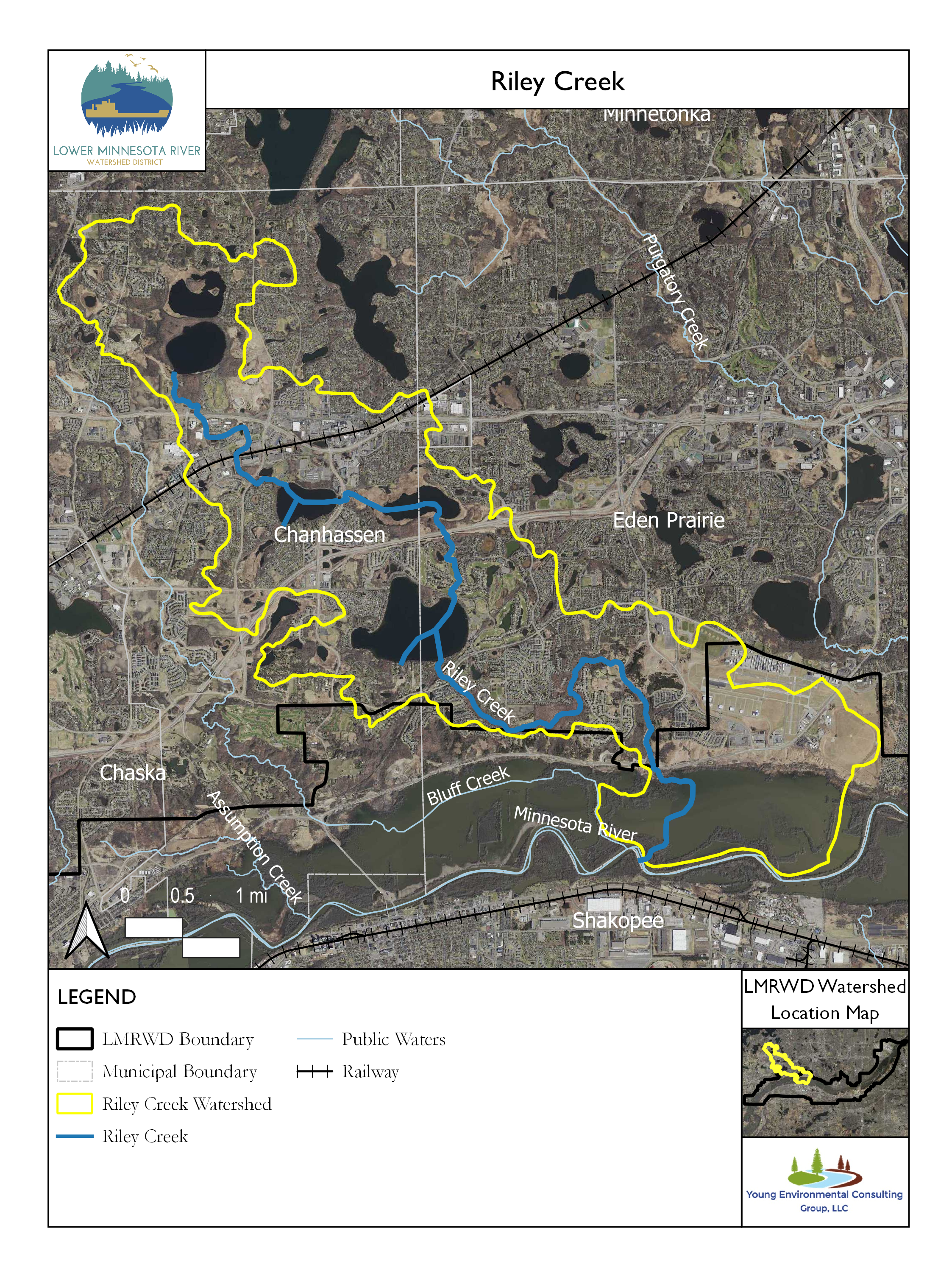 Riley Creek is a 10-mile (16-kilometer) long stream located in Hennepin County that drains about 13 square miles (3,400 hectares) (MetCo, 2014). It begins at Lake Lucy in Chanhassen and runs through lakes, open land, urban areas and the Minnesota Valley National Wildlife Refuge before discharging to the Minnesota River. The watershed is 7% commercial, 3% farmland, 29% residential, 40% open space, and 7% roads (RPBWD, 2019). Riley Creek is listed as impaired for aquatic life because of benthic macroinvertebrate and fish bioassessments and turbidity (MPCA, 2022). Aquatic recreation in Riley Creek is impaired because of Escherichia coli (MPCA, 2022).