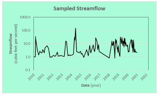 Streamflow, the amount of water carried by the creek at the sampling site, was usually measured each time a sample was collected. The streamflow data are processed separately from the other data so the streamflow measurements for 2021 had not been updated in the database when the data were downloaded on April 4, 2022. Lakes upstream of the sampling site control the extreme flows typical of most creeks of this size. Streamflow rarely drops below 1 cubic feet per second.