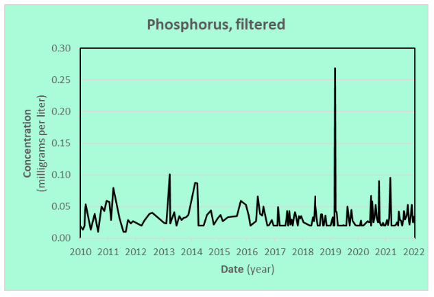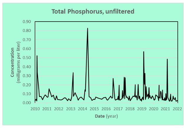 Phosphorus is an essential plant nutrient that is carried by streams. Naturally occurring phosphorus concentrations may be supplemented from animal wastes and fertilizers, and it often is introduced with runoff. Phosphorus often is associated with sediment but is more available to plants when it is dissolved in the water. The adjacent charts show the concentrations of phosphorus in samples from Riley Creek. The first chart shows the total amount of phosphorus in the water including the part associated with suspended sediment and other particulate matter. The second chart shows the phosphorus remaining in the water after the sample has been filtered to remove the sediment-associated phosphorus.