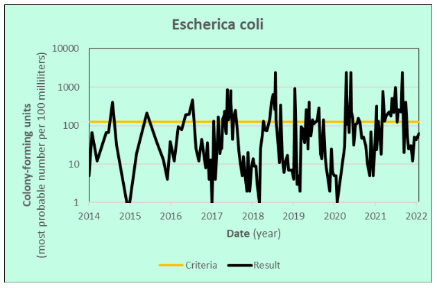 Escherichia coli (E. coli) is an organism used to indicate the amount of fecal contamination in lakes and streams. Swimming in or ingesting water with high levels of E. coli could result in illness. Riley Creek E. coli levels appear to exceed the allowable limit for recreational and human health. The allowable limit is a monthly average of less than 126 colony-forming units per 100 milliliters of water between April and October (MPCA, 2021).