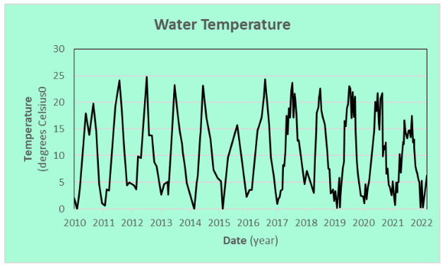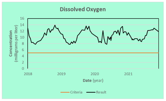 Measurements of dissolved oxygen (DO) concentration show that Riley Creek remains well oxygenated. Many aquatic animals typically need at least 5 milligrams per liter (mg/L) of DO (MNDNR, 2021). Seasonal fluctuations are normal as the solubility of oxygen changes with the temperature of the water.
