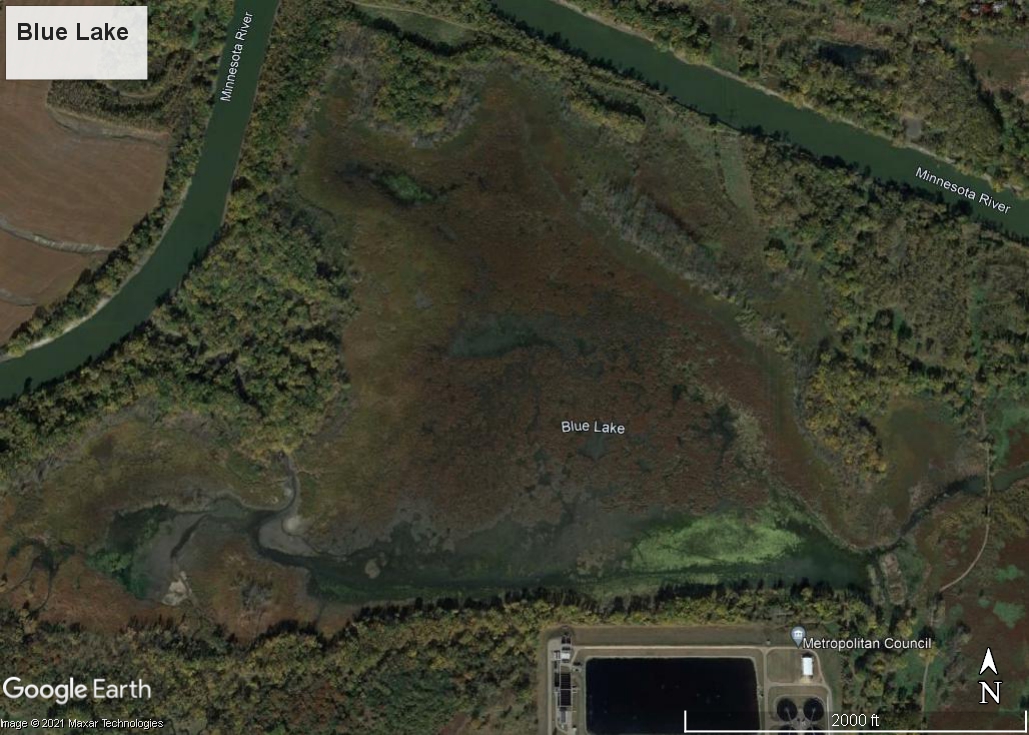 Blue Lake Wastewater Treatment Plant (WWTP), operated by the Metropolitan Council/Metropolitan Waste Control Commission, is nearby and gets its name from Blue Lake. It is evident near the bottom right (southeast) in the adjacent image. According to the U.S. Army Corps of Engineers (USACE, 2019), the Blue Lake WWTP does not discharge its processed wastewater effluent to Blue Lake but instead discharges directly to the Minnesota River upstream of Blue Lake. The only discharge from the plant to Blue Lake is untreated groundwater that the plant pumps as needed to protect underground infrastructure within the facility. The plant added more dewatering capacity in 2008 after record flood events increased groundwater levels higher than targeted. Typical quantities are 1.0 to 1.5 billion gallons per year.